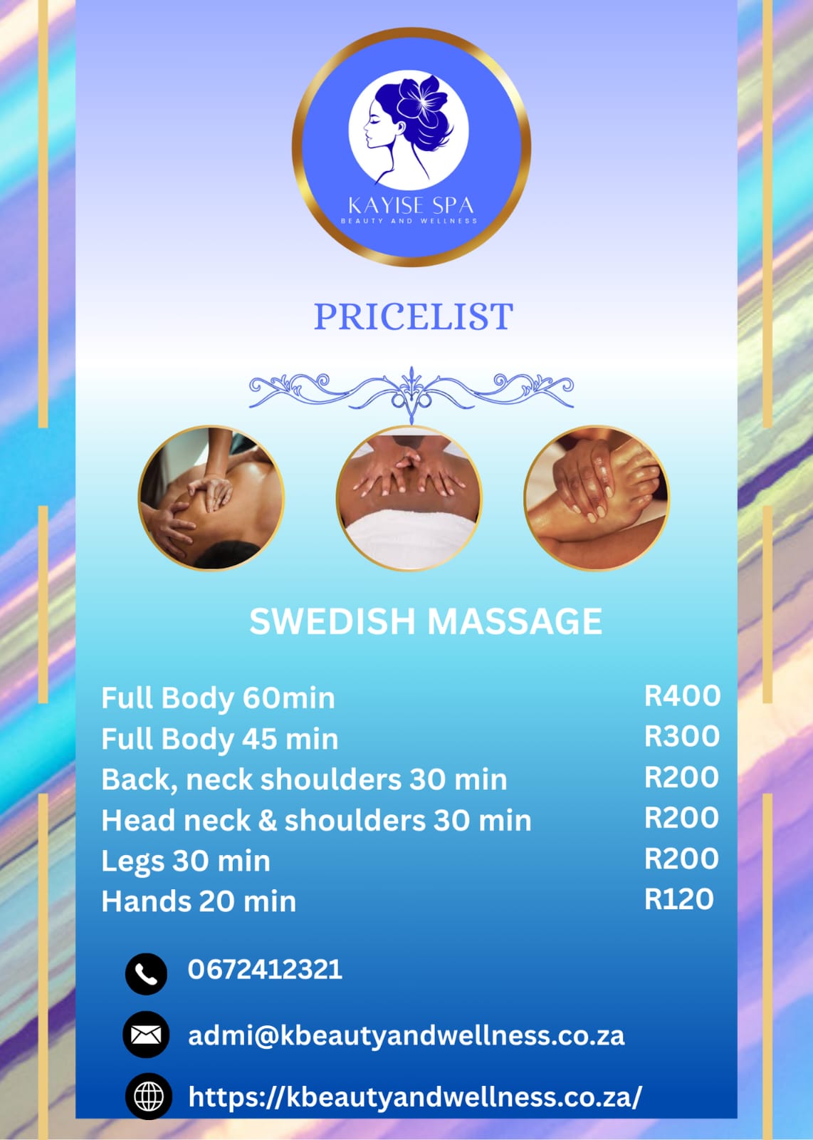 - Swedish Massage – A gentle, soothing treatment ideal for relaxation and improved circulation